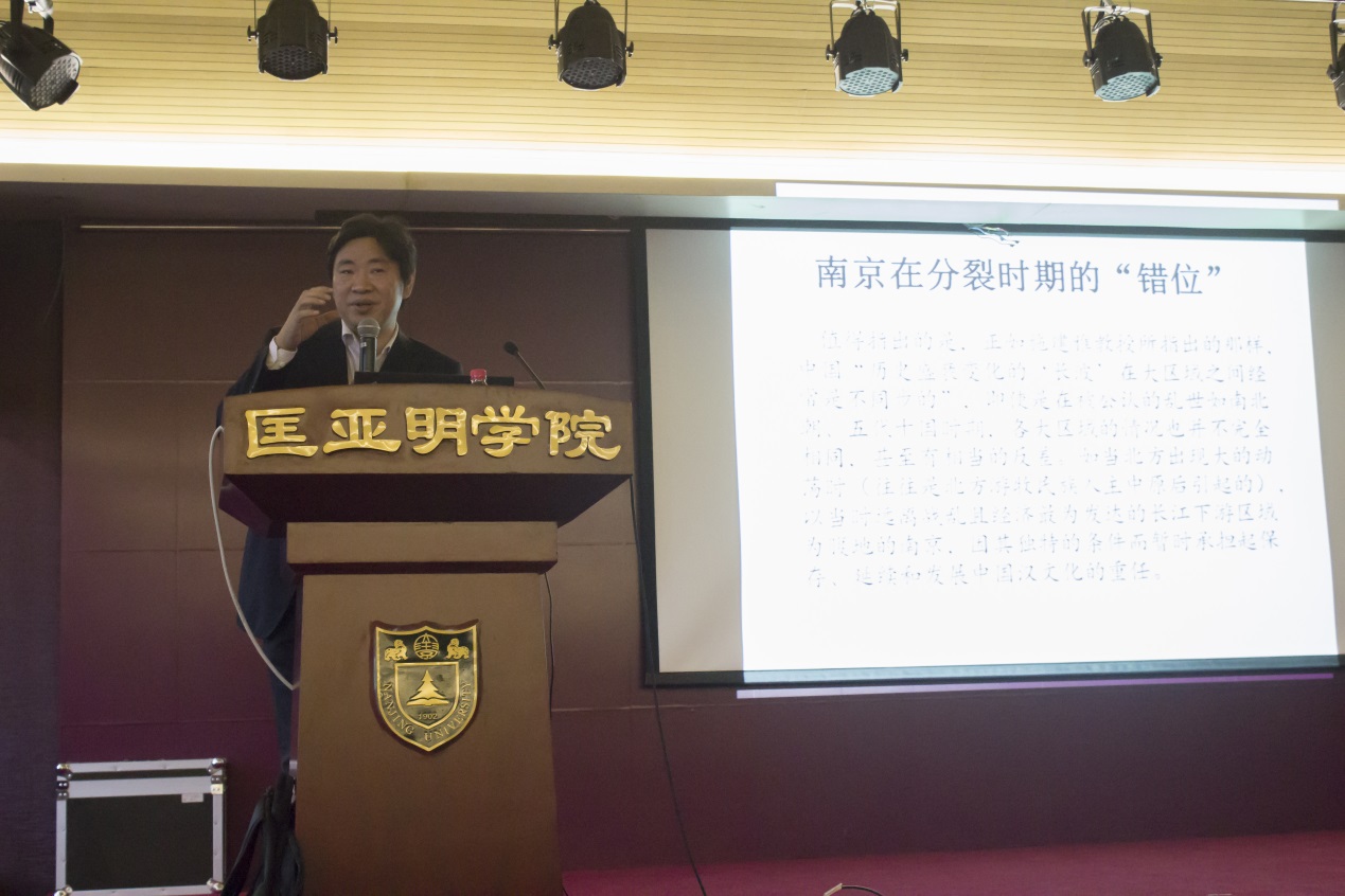 夏老师讲座的主题是南京的悲情历史角色。他首先向同学们详细介绍了南京的历史,让大家对南京的历史有了一个大概的认识。之后,他借助一些文学上的例子和历史上的记载,向大家介绍了南京悲情角色的由来。最后,夏老师从地理、政治等方面详细分析了出现这种情况的原因。整场讲座风趣盎然,同学们时而沉醉于夏老师的精彩叙述中,时而为夏老师的风趣纷纷鼓掌称赞。