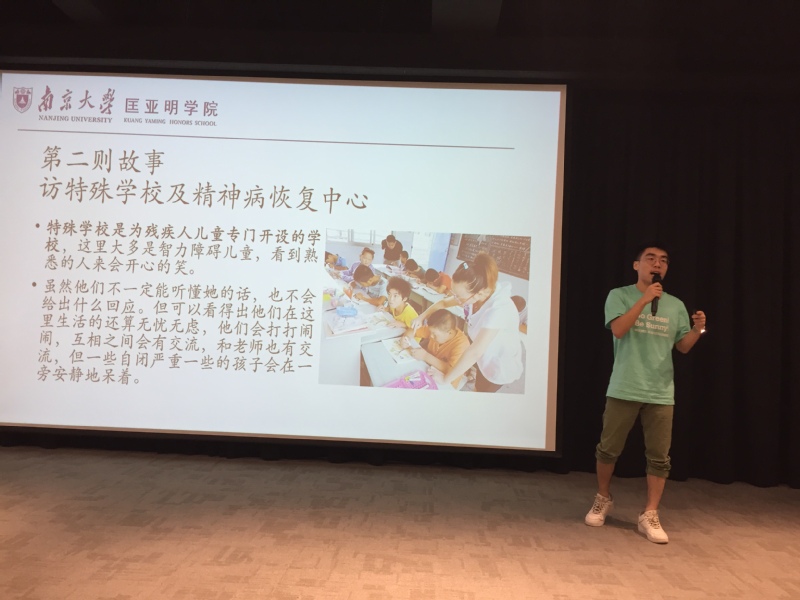 24日下午,5所院校代表分享了各自在社会精神健康发展中所做的贡献。我院副团长帖鑫同学以“停下来,静静地听听他们的故事”为报告主题,着重介绍了两类志愿者活动:一是,南大纽·工作营;二是,访问特殊学校及精神病恢复中心。他特别提出,精神健康支持应该在群体之下,更多关注独立个人的关怀。