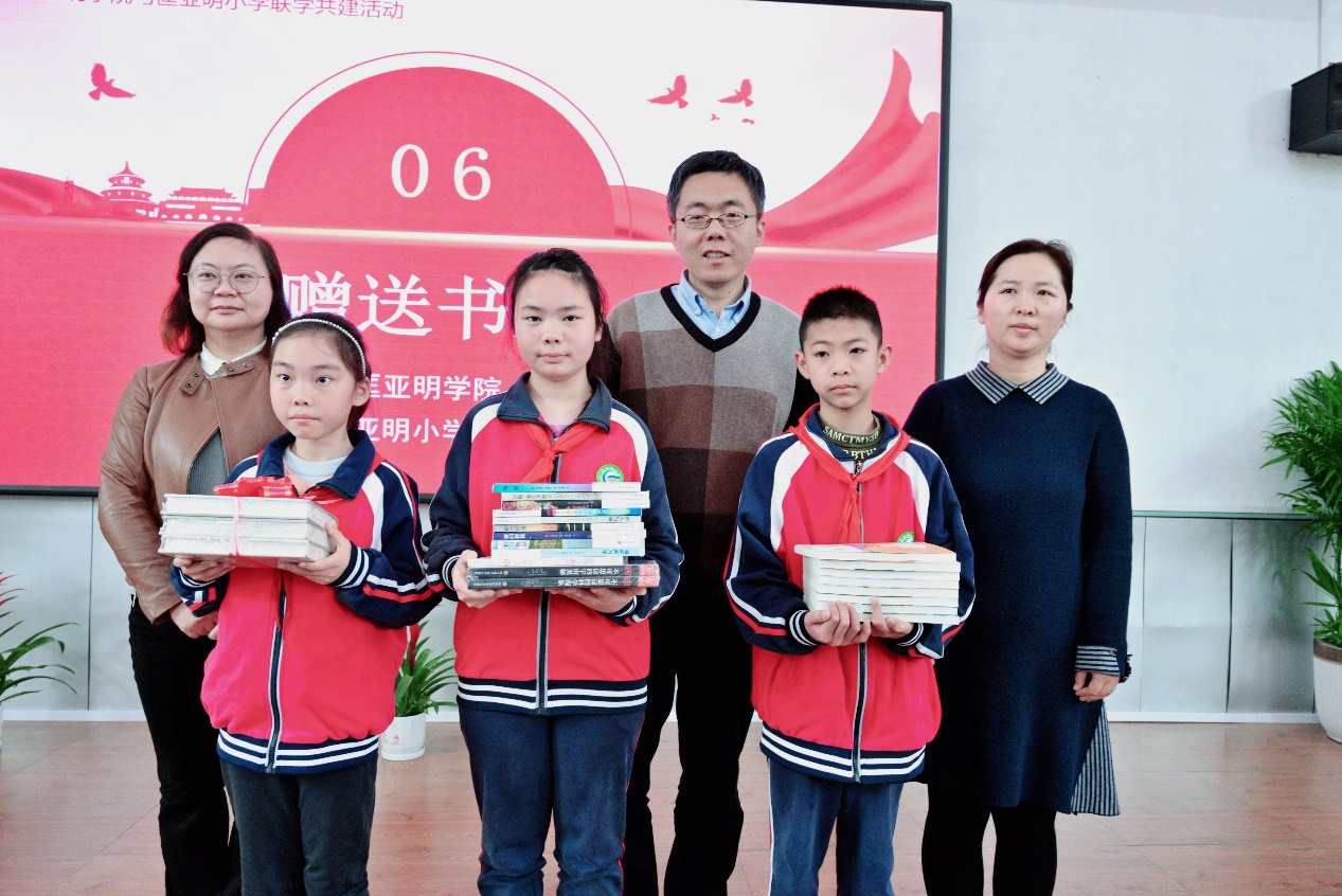 麻豆视频 教师代表向匡亚明小学少先队员赠送书籍,表达了对少先队员通过读书不断丰盈精神宝库的美好祝愿。