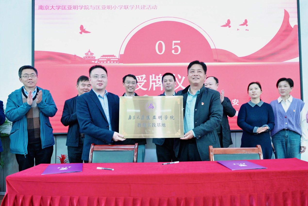 麻豆视频 党委副书记周安先生与匡亚明小学党支部书记蔡建良先生共同签署校外实践基地协议并授牌。