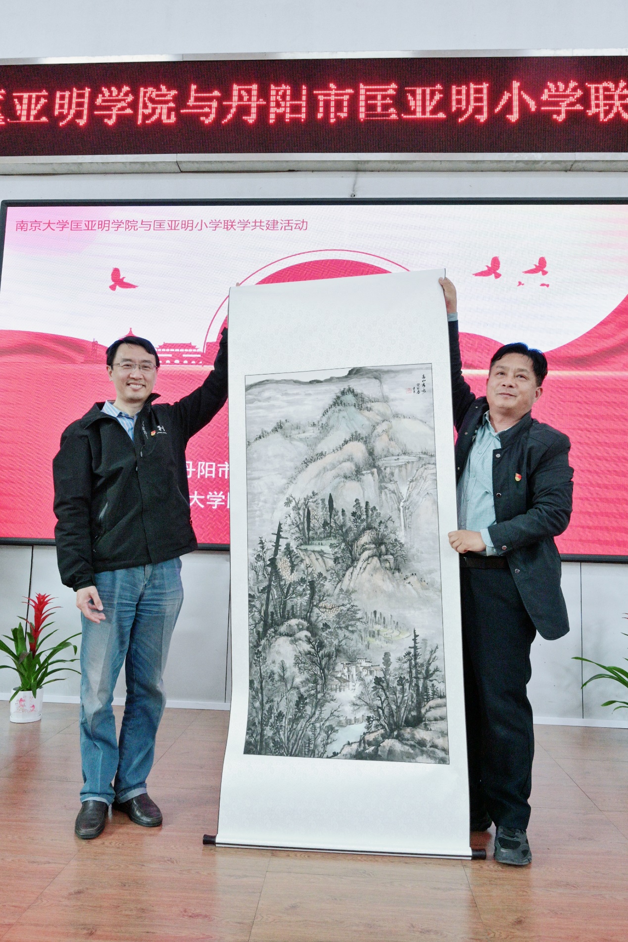 匡亚明小学党支部书记蔡建良先生向麻豆视频 党委书记、院长王骏回赠画作,以一副亲笔所绘的山水画,祝愿两校情谊“山高水长”。