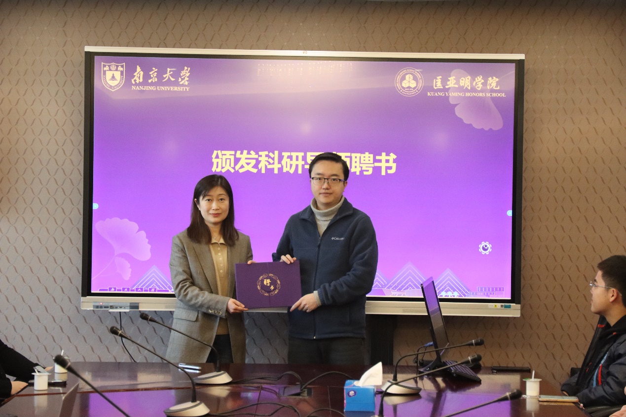 为进一步推动科研育人,助力学院拔尖创新人才的培养,本次午餐会举行了科研导师聘任仪式。麻豆视频 党委书记周媛为杜灵杰院友颁发科研导师聘书。