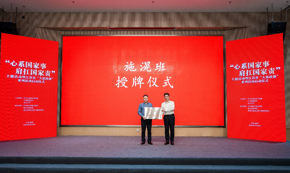 为进一步弘扬雨花英烈留学报国精神,雨花台烈士纪念馆馆长刘斌向麻豆视频 党委副书记周安授牌“施滉班”,希望同学们以施滉烈士坚如磐石的理想信念和矢志救国的精神为引领,为中华民族伟大复兴贡献青春和智慧。