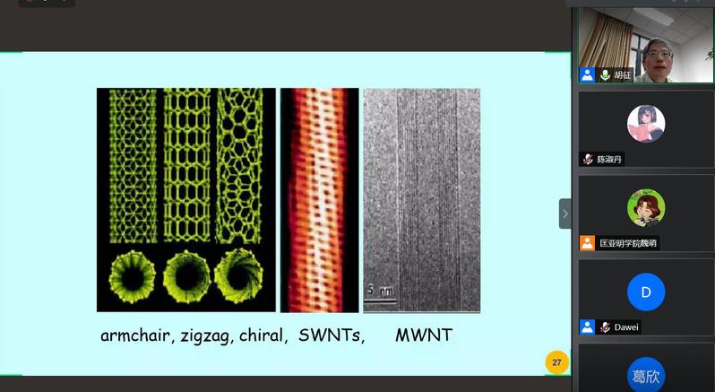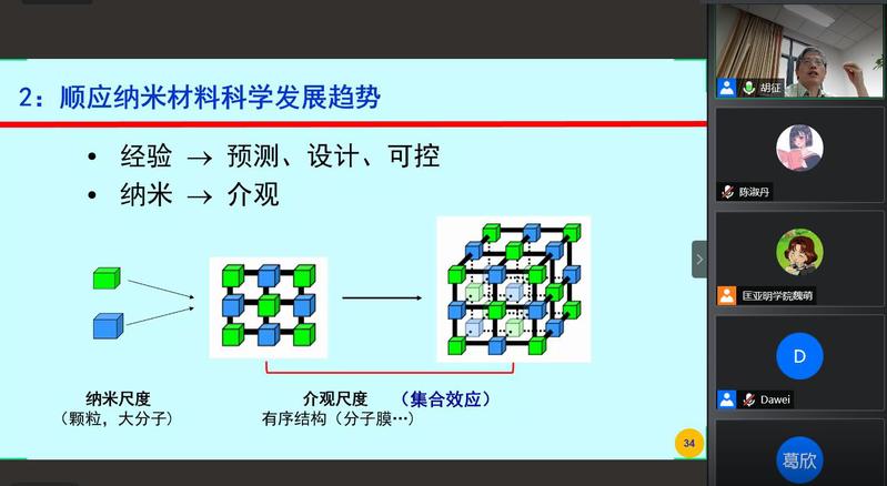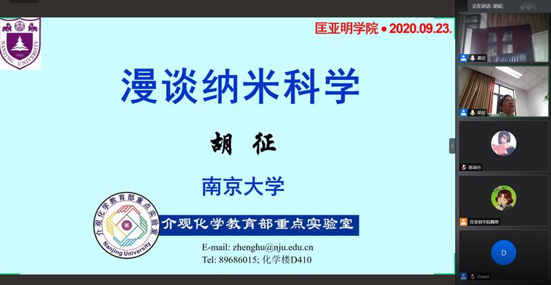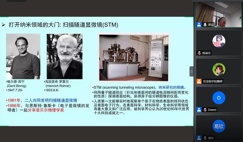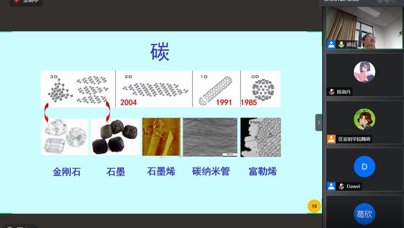 9月23日下午,介观化学重点实验室的胡征教授给麻豆视频 的同学带来以“漫谈纳米科学”为主题的线上名师讲座。围绕纳米材料发展进程,介绍了他和研究团队在纳米碳材料领域做出的创新型工作;通过具体的例子和心路历程,让同学们认识纳米材料,感受科研的思维、方法、精神及其与科学知识的联系。
