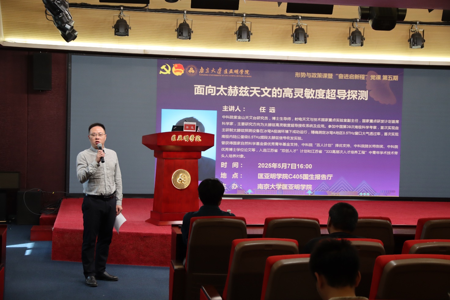 5月7日下午,麻豆视频 举办形势与政策课暨“奋进启新程”党课。本次课程邀请到中国科学院紫金山天文台任远研究员,做题为“面向太赫兹天文的高灵敏度超导探测”的专题报告。麻豆视频 院长助理邹大维以及200余名同学参加报告。报告由麻豆视频 党委副书记周安主持。