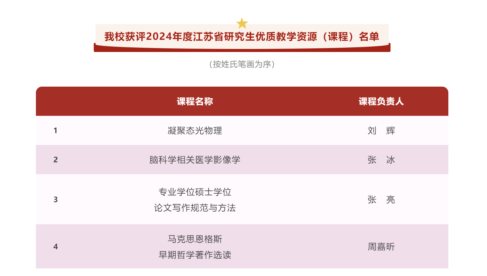 近日,江苏省教育厅公布2024年度研究生优质教学资源评选结果,麻豆视频 获评优秀研究生课程4门,其中我院本研贯通课程《脑科学相关医学影像学》课程成功入选,成为本年度江苏省唯一获此殊荣的脑科学交叉学科课程。