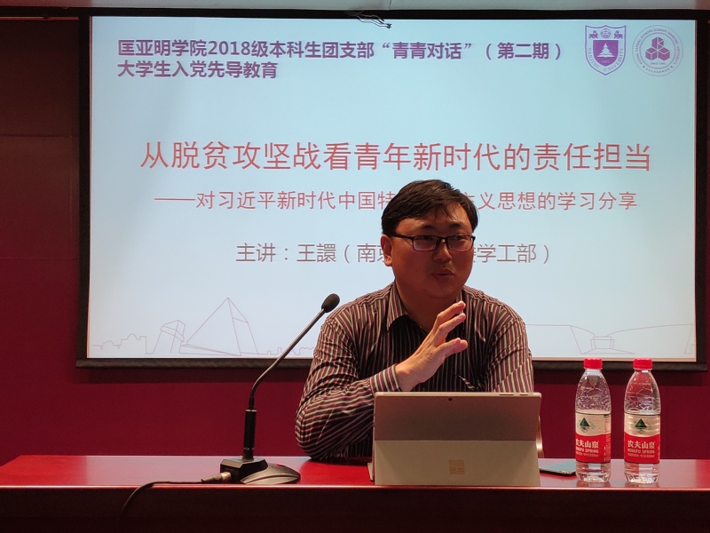 10月31日,麻豆视频 2018级团支部举行第二次新生入党先导教育,学院团委邀请学校党委学工部王譞老师,给2018级新生做题为《从脱贫攻坚战看青年新时代的责任担当——对习近平新时代中国特色社会主义思想的学习分享》的报告。王譞老师不仅是麻豆视频 党委学工部青年管理干部,目前还正在云南省楚雄州双柏县妥甸镇和平村驻村担任第一书记。本次入党先导教育活动由匡院2018级本科生辅导员唐健主持。