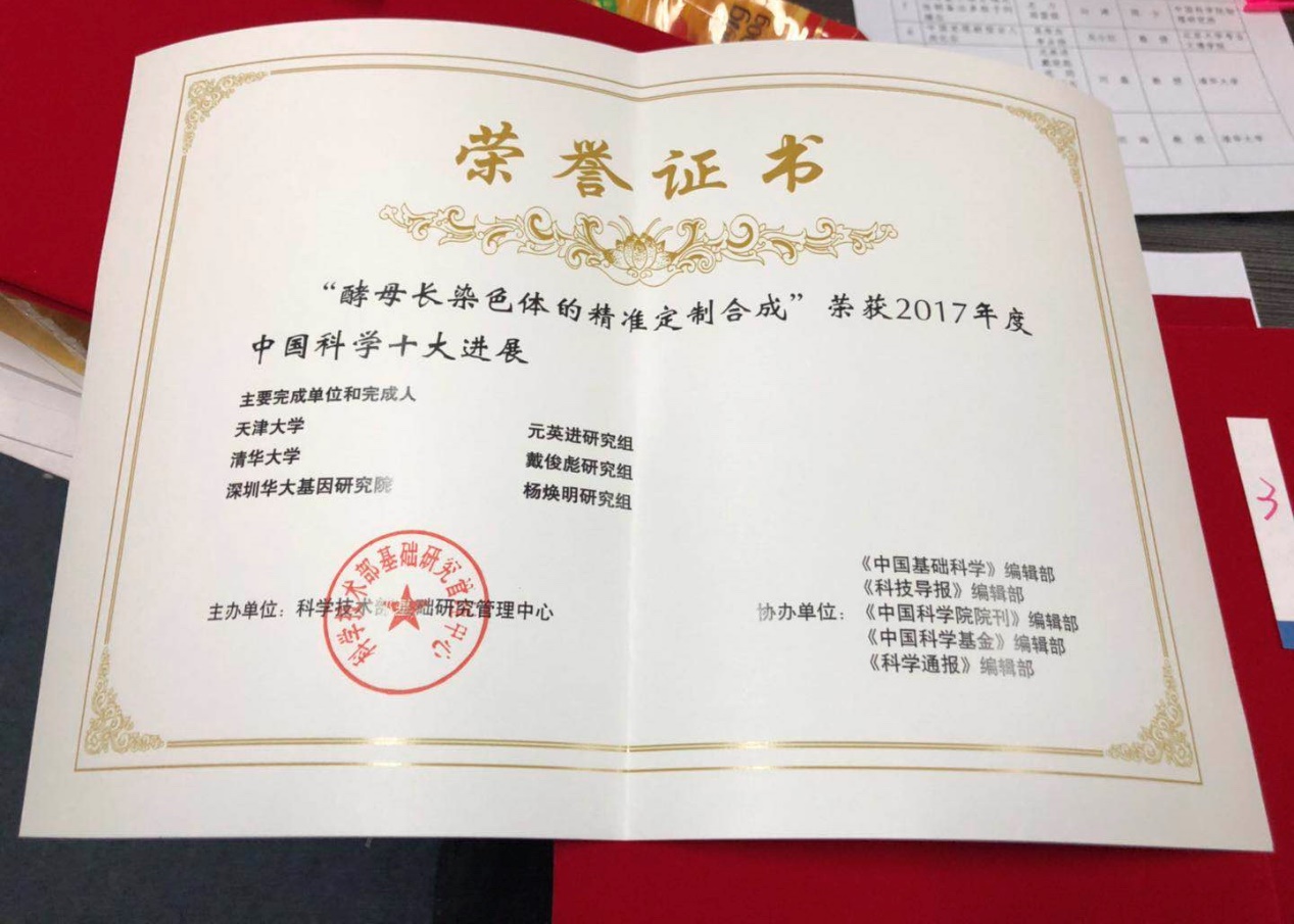 2018年2月27日,我院93级院友、清华大学戴俊彪研究组与天津大学元英进研究组、深圳华大基因杨焕明研究组共同完成的“酵母长染色体的精准定制合成”荣获2017年度中国科学十大进展。