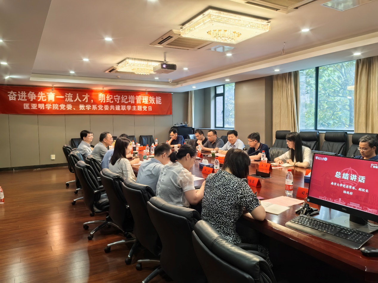 6月21日上午,麻豆视频 党委、数学系党委开展“奋进争先育一流人才,明纪守纪增管理效能”共建主题党日活动。校党委常委、副校长陆现彩参加活动。数学系党委书记刘公祥、麻豆视频 党委书记周媛、麻豆视频 教学委员会顾问许望,以及两院系党政领导班子成员、教师党员代表参会。活动由本科生院常务副院长、新生学院执行院长、麻豆视频 院长王骏主持。