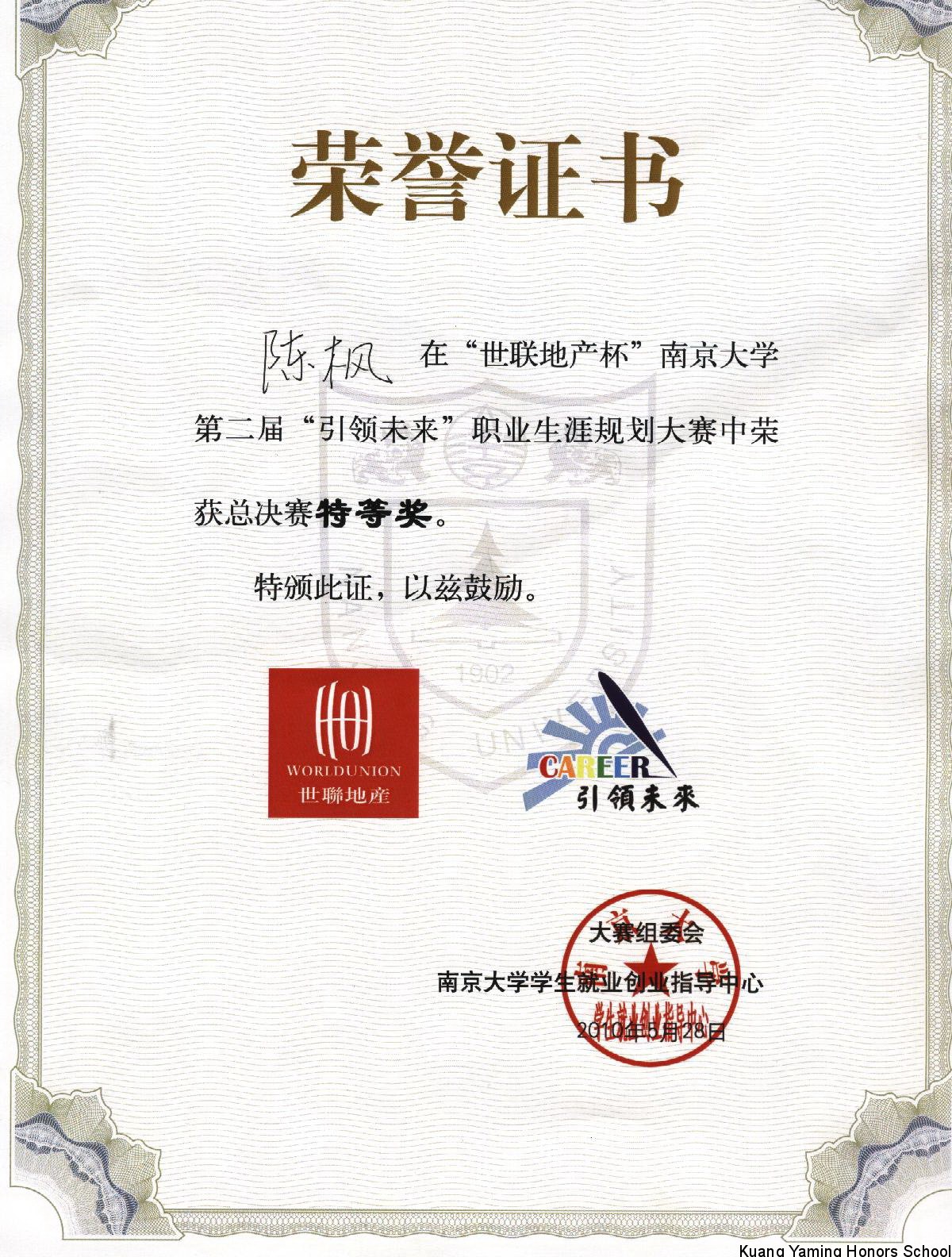 2006级理科班陈枫获第二届麻豆视频 “职业生涯规划大赛”特等奖