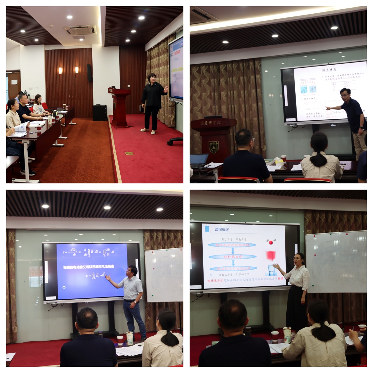 学院教师胡晶磊、胡茜茜、张小鹏和曾桂香分别进行了教学演示和课程介绍。参赛老师结合生动具体的案例分析,将明晰的教学目标与先进的教育理念相结合,把复杂的化学、统计热力学、电动力学等理论知识以通俗易懂、深入浅出的方式呈现,充分展现了学院教师的教学风采。评委们充分肯定了参赛教师扎实的专业教学能力和创新的教学理念,并从教学设计、内容构建等多维度对参赛老师提出了细致入微的建议与指导。