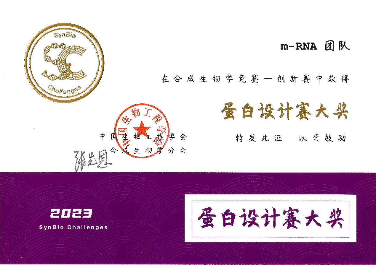 8月5日,由中国生物工程学会合成生物学分会主办的第二届合成生物学竞赛·创新赛在深圳理工大学(筹)明珠校区举办了现场答辩及颁奖典礼。本次活动吸引了来自全国(含港澳)48所高校共80支队伍合计超400人线下参赛,线上线下超421万人次观赛。经过历时近半年的激烈角逐,我校董昊教授课题组的张一健(化院19本、匡院23硕)、陈子川(匡院19本)和臧敏(匡院21硕)等三位具有化学和计算机学科背景的同学组成的麻豆视频 “m-RNA”团队最终以总分第一的成绩荣获蛋白设计赛大奖(金奖)。
