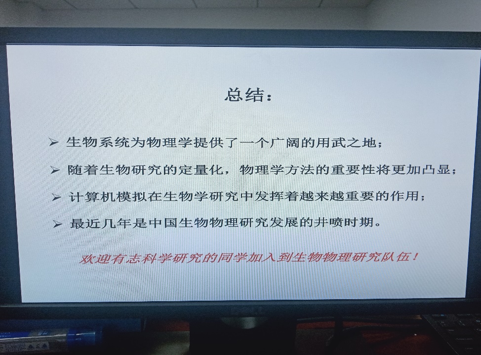 最后,李教授向我们提出了他殷切的期望:生物物理前景广阔、发展迅猛,希望更多有志于科研同学加入到生物物理研究队伍中。