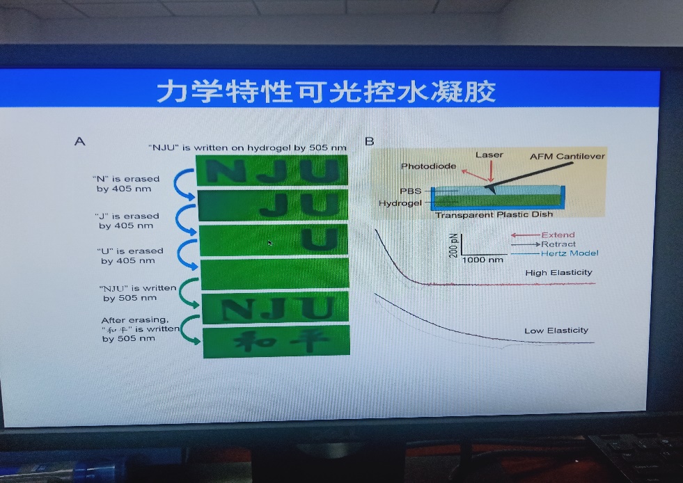在第一部分的最后,李老师还以他带领的实验室所做的工作为例给我们介绍了生物物理的前沿进展,比如力学特性可光控水凝胶。