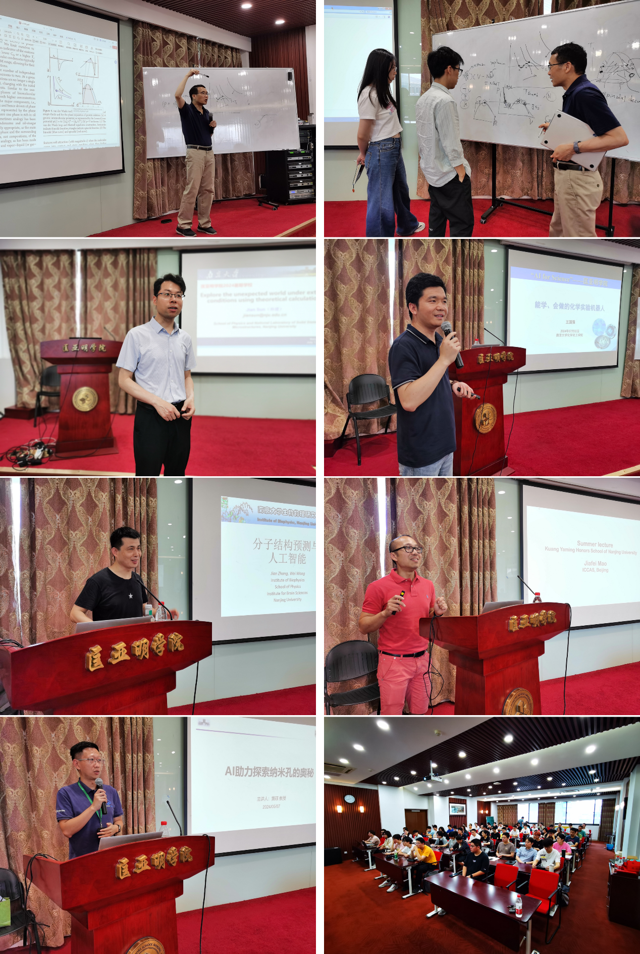“AI for Science”系列讲座邀请了来自物理、化学、生物等领域的学者,围绕人工智能方法在各自领域的发展和应用进行讲授。我校物理学院教授、国家杰青孙建老师介绍了《基于机器的材料模拟方法及其在交叉学科中的应用》;我校化学化工学院王国强副教授介绍了《能学、会做的化学实验机器人》;我校物理学院张建教授介绍了《机器学习与RNA结构预测》;我院01级院友、中国科学院化学研究所毛佳飞研究员介绍了“Unraveling the molecular mechanisms of membrane proteins -a journey through mentorship, collaboration and community”;我校化学化工学院教授、国家杰青黄硕老师介绍了《AI助力探索纳米孔的奥秘》。这些专题报告展示了不同人工智能算法的基本原理以及在不同领域的应用方式,揭开了人工智能的神秘面纱,帮助同学们建立人工智能在科学研究应用中的全景概念,拓宽学术视野、激发科研兴趣。