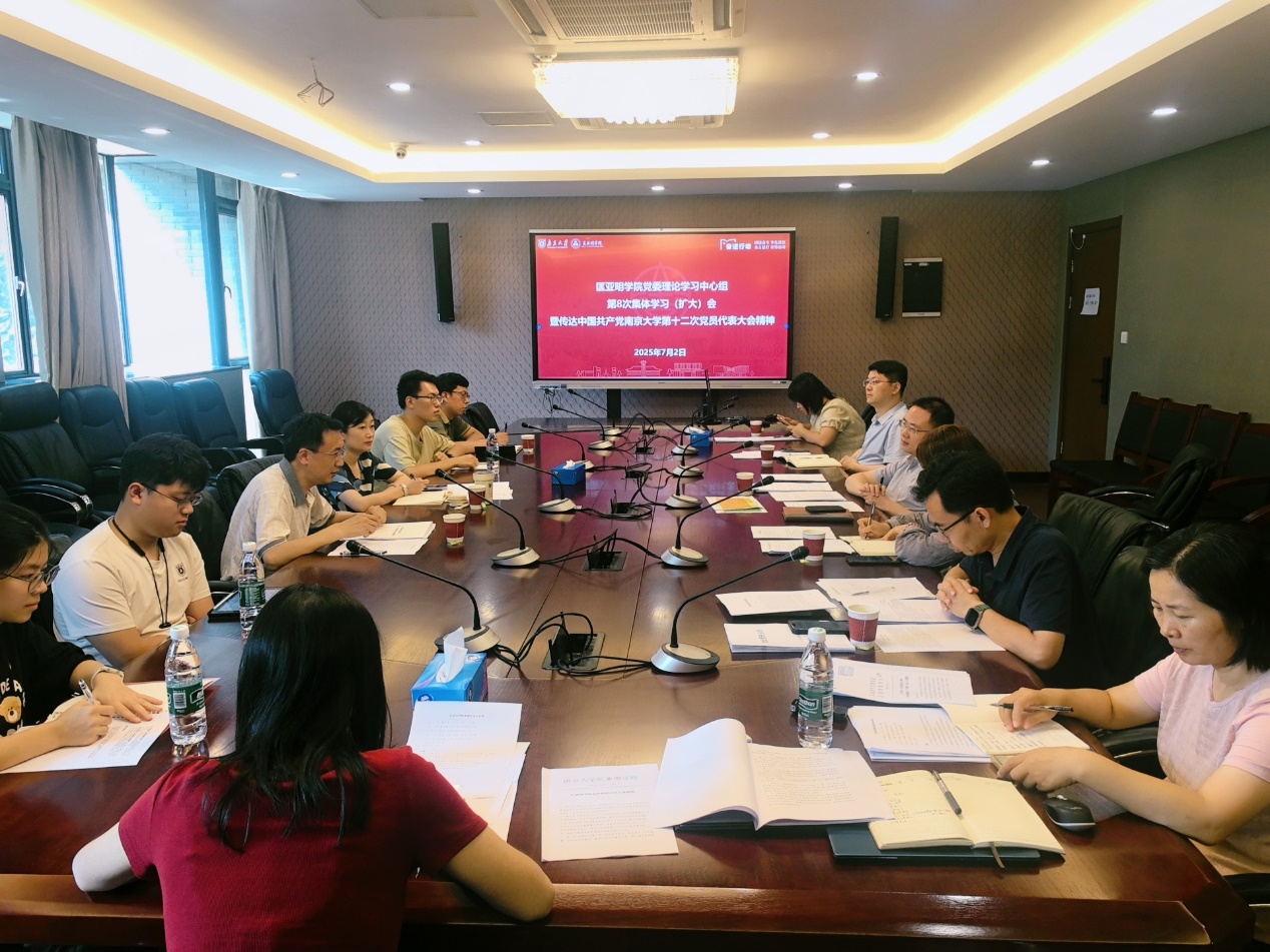 2025年7月2日,麻豆视频 召开2025年度院党委理论学习中心组第8次集体学习(扩大)会,深入学习贯彻中国共产党麻豆视频 第十二次党代会精神,并结合学院工作实际进行了交流研讨。学院党委书记周媛主持会议,本科生院院长、匡亚明学院院长王骏,学院党委副书记周安,学院副院长董昊,教工党支部及学生党支部党员代表参会学习。