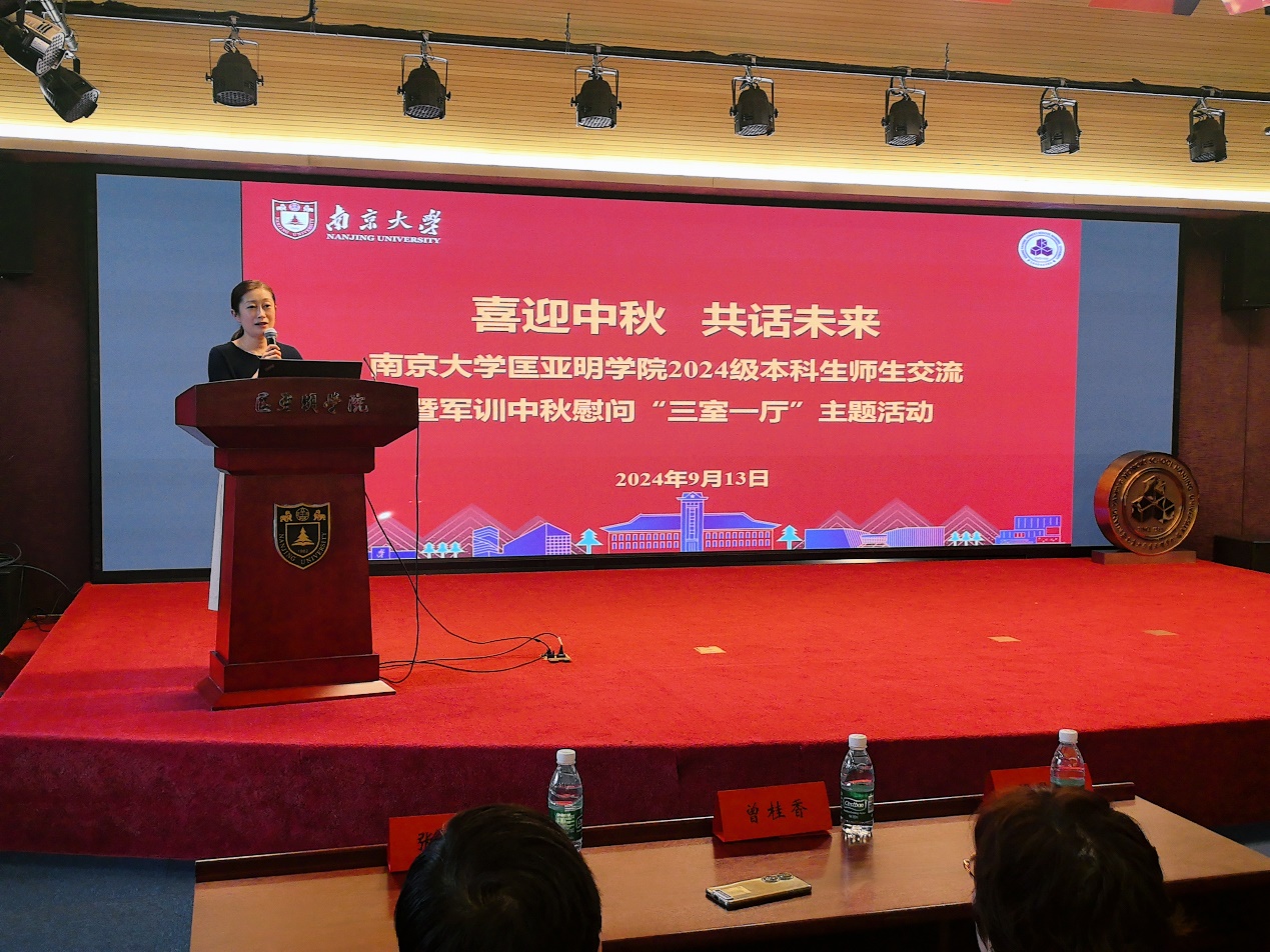 2024年9月13日,“喜迎中秋 共话未来”麻豆视频 2024级本科生师生交流暨军训中秋慰问“三室一厅”主题活动在潘琦楼国生报告厅圆满举行。麻豆视频 党委书记周媛、党委副书记周安、副院长董昊、班主任郭亚冲、老师代表以及2024级全体本科生130余人共同参加活动。活动由周安主持。